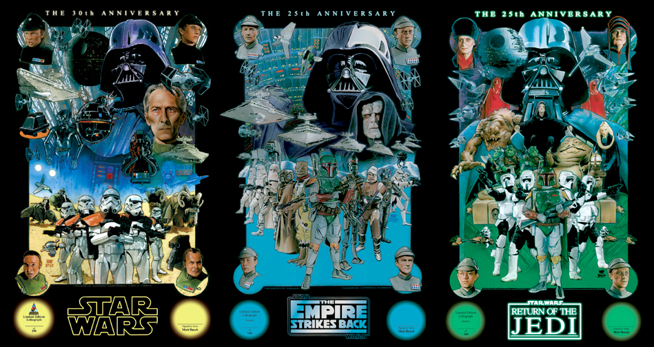 Lucasfilm has graciously authorized this limited edition poster by STAR WARS artist Matt Busch. This piece completes the Original Trilogy set of villain-style posters that Busch has produced for the films’ anniversaries over the years. The standard poster size measures 24″ X 36″ and is printed on thick 100 lb. stock with a deluxe aqueous coating.