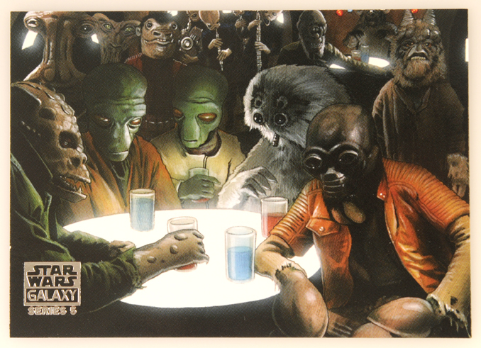 This trading card from Topps’ STAR WARS GALAXY 5 series brands Matt Busch’s vision of the Mos Eisley Cantina, and all the exotic alien creatures audiences were first treated to with the release of the movie in 1977.