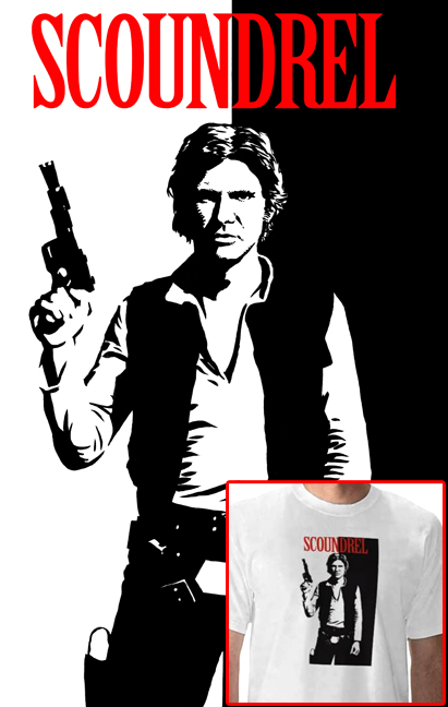 From the fine folks at Zazzle, this killer new STAR WARS T-Shirt features Han Solo artwork by Matt Busch. In the style of the SCARFACE movie poster, this shirt will remind your significant other who the real scoundrel in their life is.